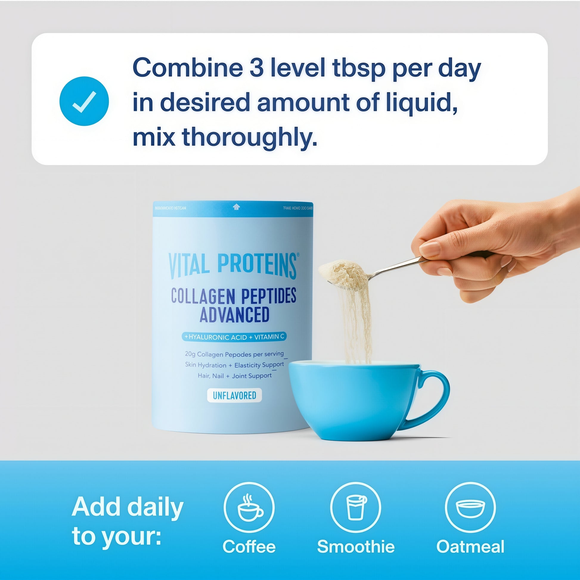 Current research suggests consuming between 10-20g of collagen peptides per day (the equivalent of 2-4 tablespoons). When taken daily in your coffee, smoothie, water, or even oatmeal, you can begin to see and feel the benefits of collagen.